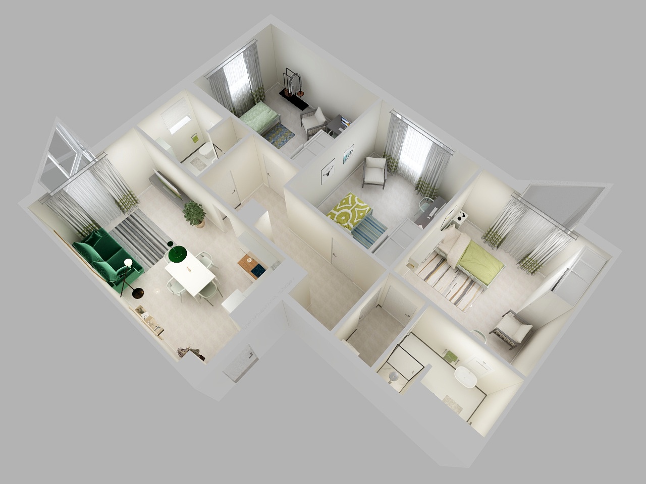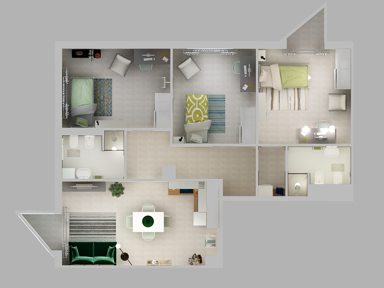 L’appartamento è composto da angolo cottura attrezzato e sala con tavolo, sedie, mobile sala, divano due posti, tre camere singole (ciascuna arredata con letto, comodino, scrivania, sedia, armadio a due ante, poltrona) e due bagni con doccia.