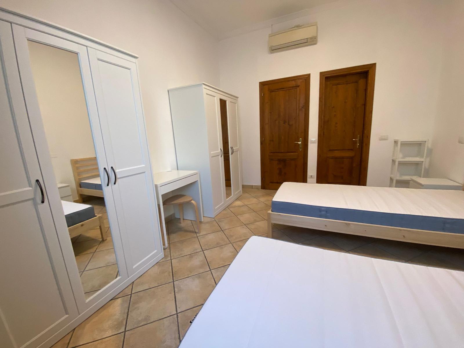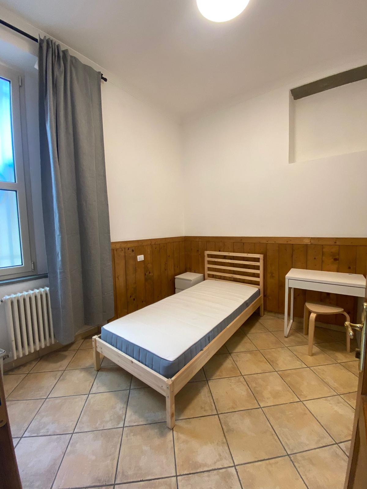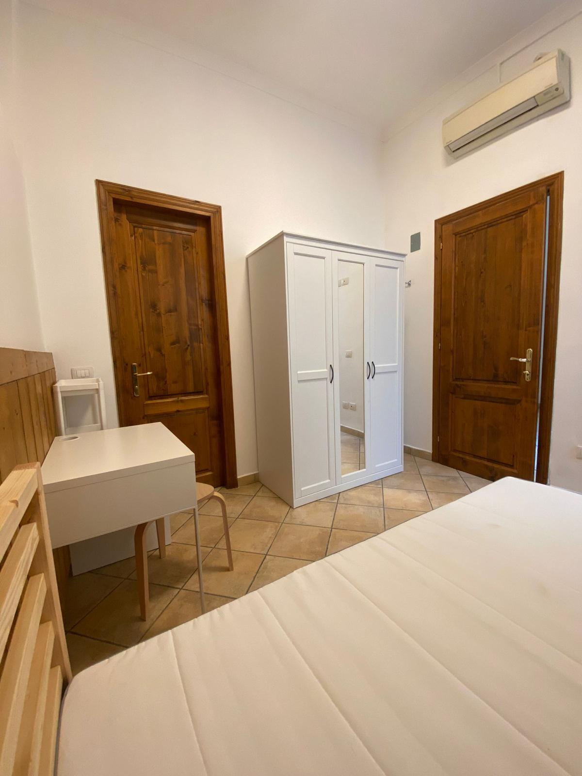 arredata con letto, armadio, comodino, una scrivania e sgabello, bagno completo di doccia; riscaldamento centralizzato, aria condizionata e WI-FI.