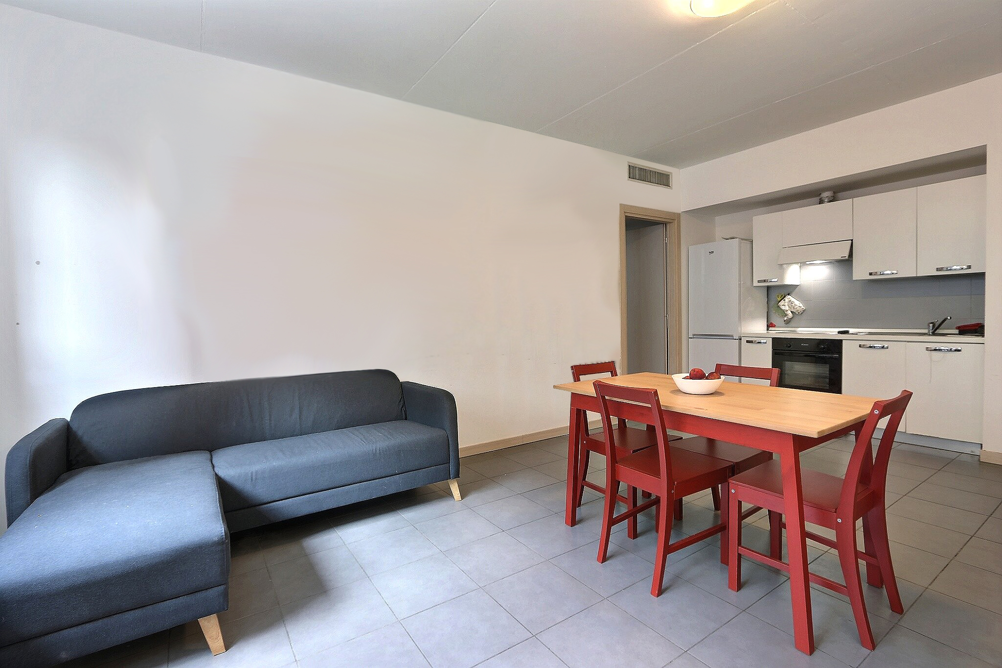 L’appartamento, completamente arredato, è composto da soggiorno con cucina a vista, due camere doppie, due bagni. E’ possibile richiedere la camera doppia a uso singola.