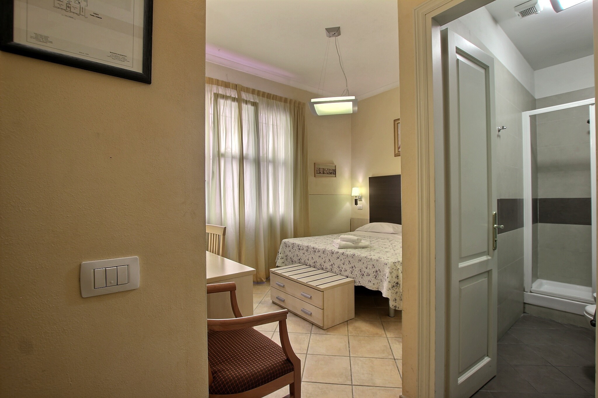 arredate con letto, armadi, comodini, una scrivania e sedia, televisore, minifrigo, bagno completo di doccia; riscaldamento centralizzato, aria condizionata e WI-FI.