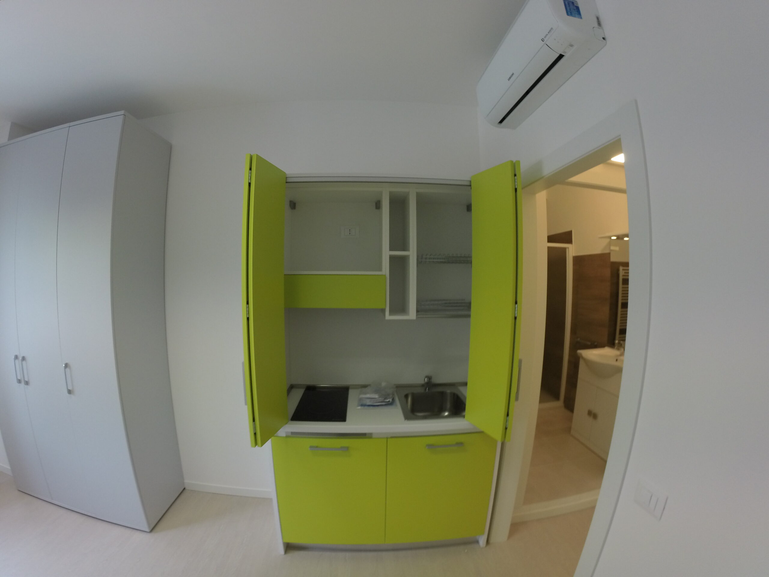 L’ alloggio è completo di mobile dispensa con lavandino, frigorifero, spazio soggiorno, letto singolo, bagno ad uso esclusivo.