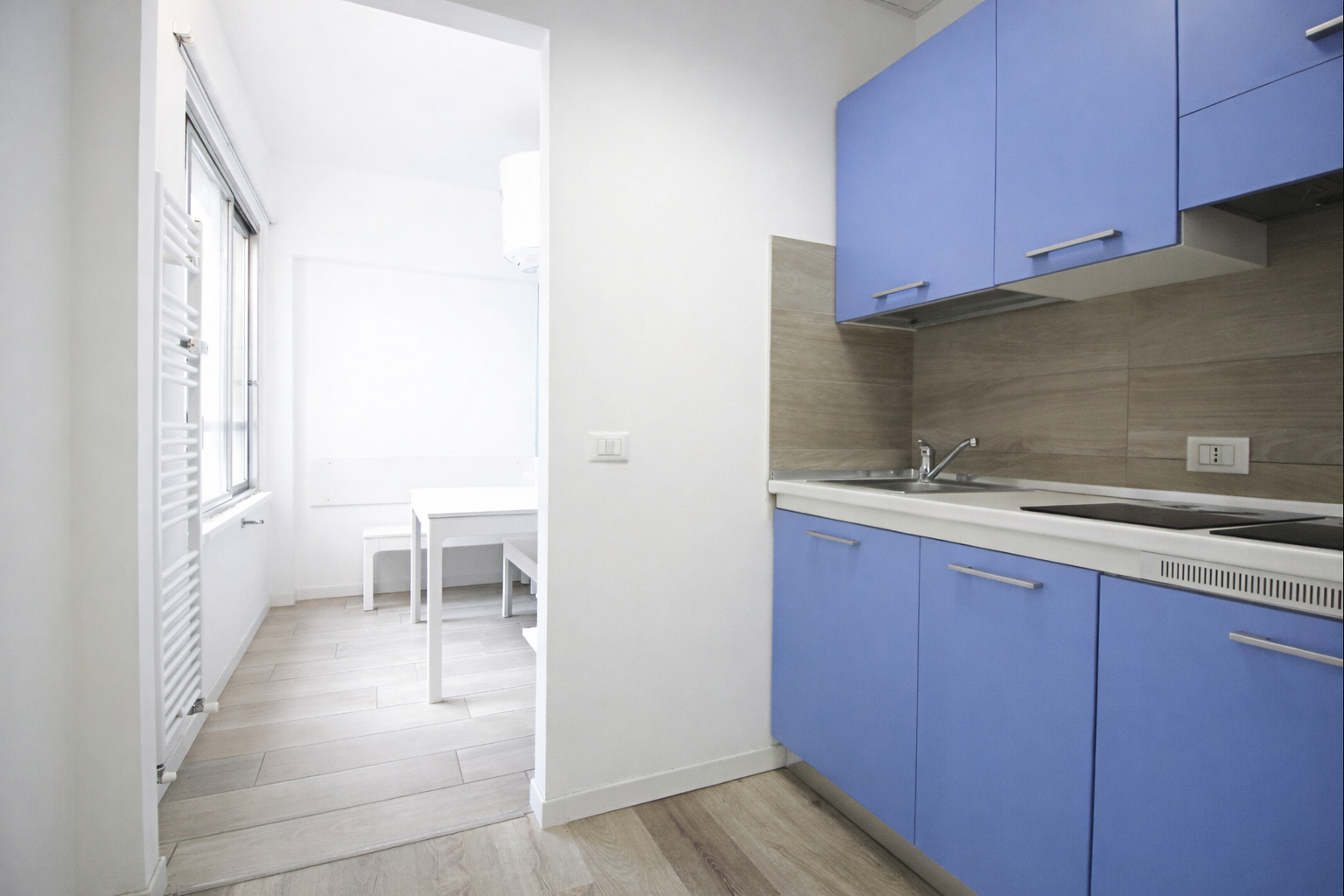 La stanza è completa di mobile cucina con microonde, mini-frigorifero,  spazio soggiorno, letto singolo, bagno in comune con un’altra camera.
