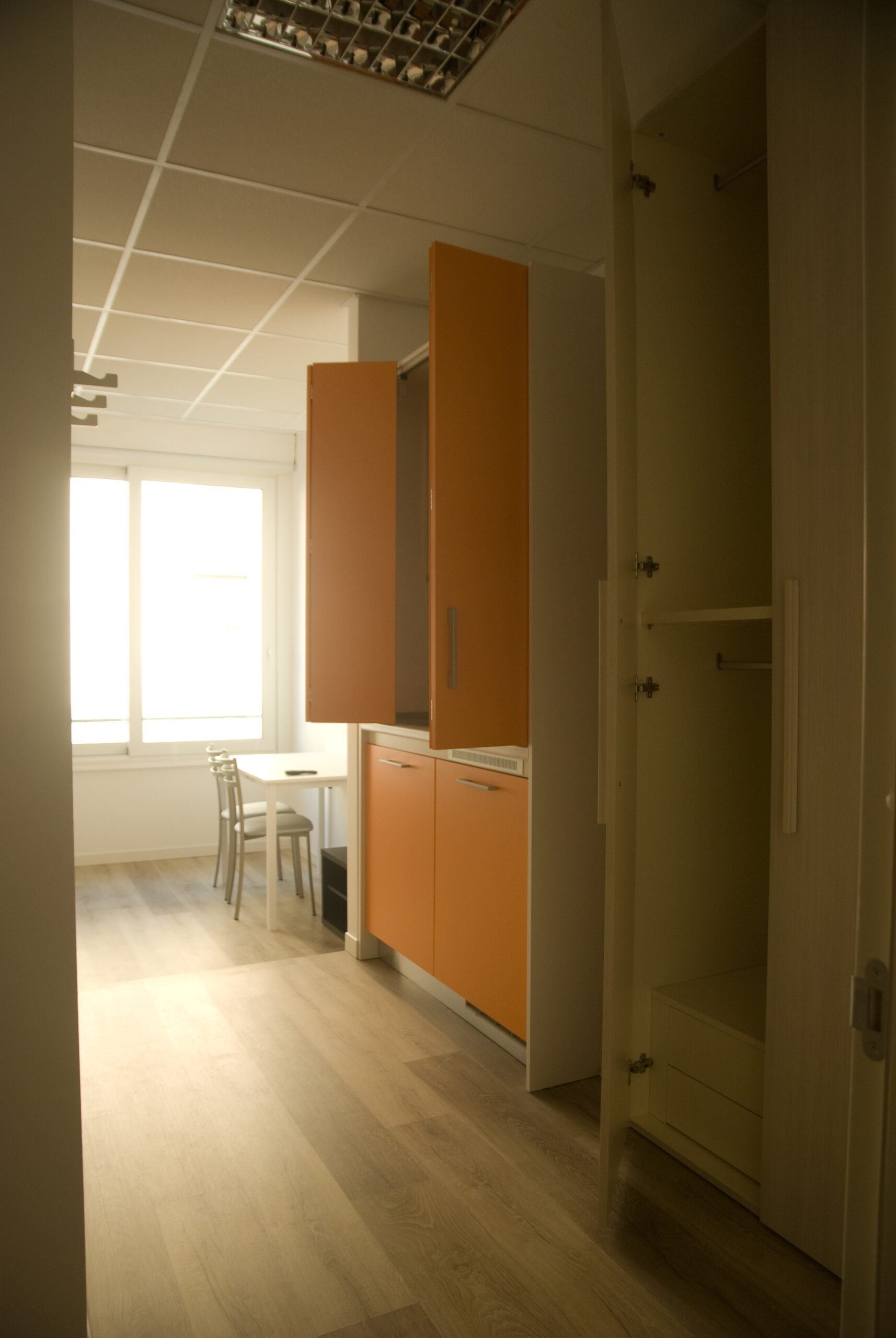 La stanza è completa di mobile cucina con microonde, mini-frigorifero, spazio soggiorno, letto singolo, bagno ad uso esclusivo.