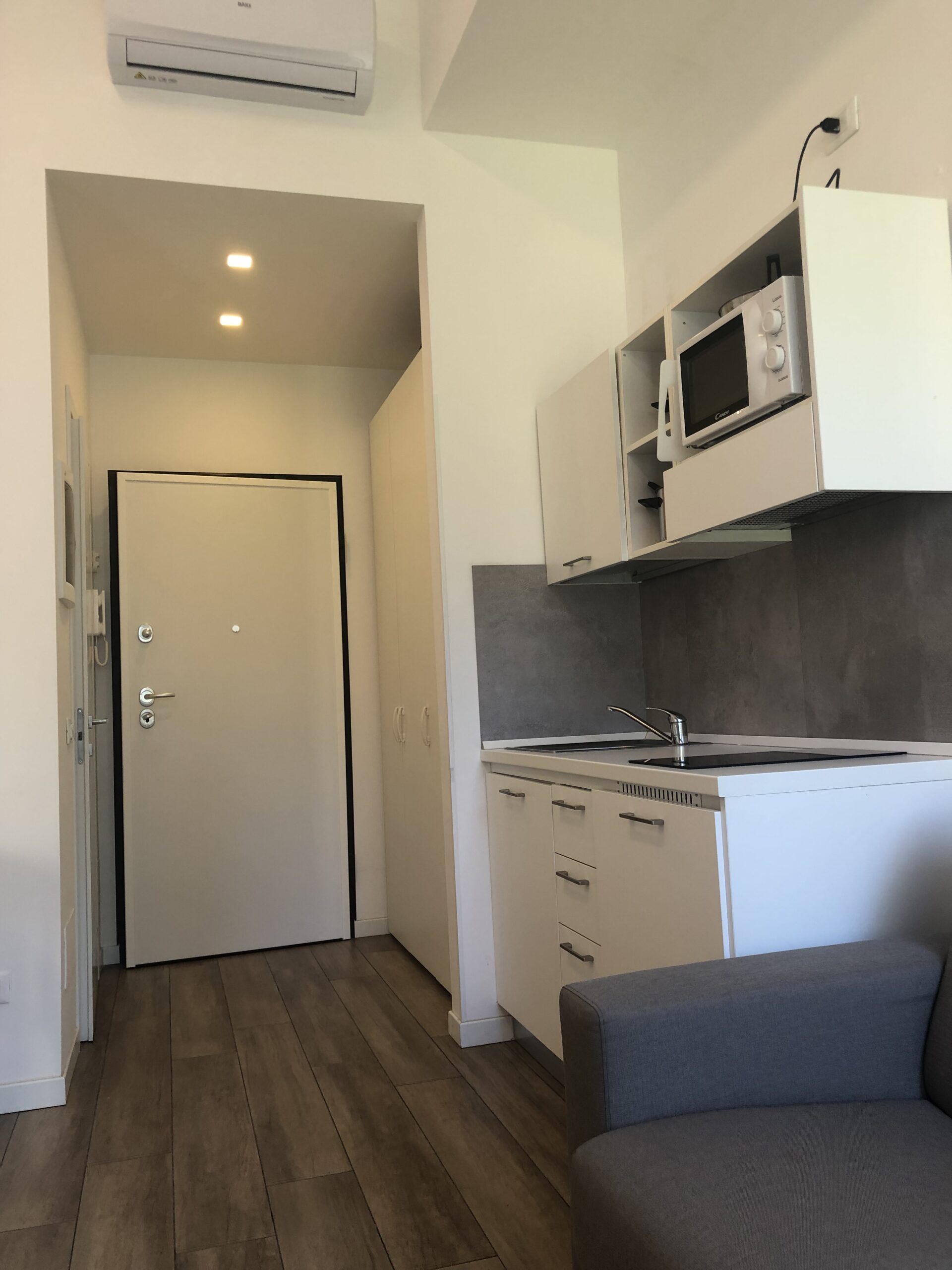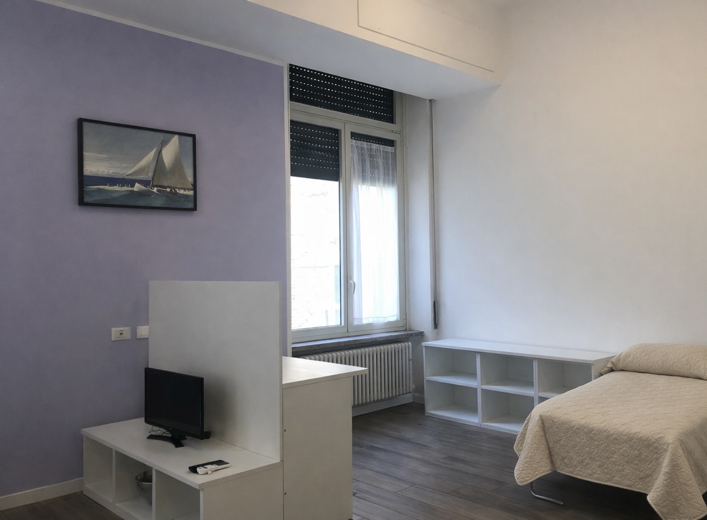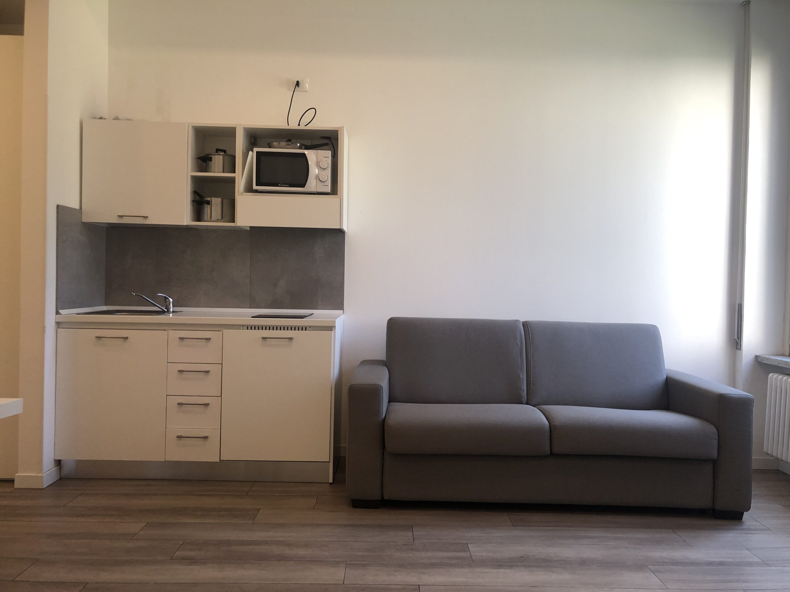 Il monolocale è completo di angolo cottura con piano induzione, piccolo frigorifero e forno microonde, angolo salotto con tavolo, sedie e TV, armadio, libreria, letto singolo e bagno ad uso esclusivo.