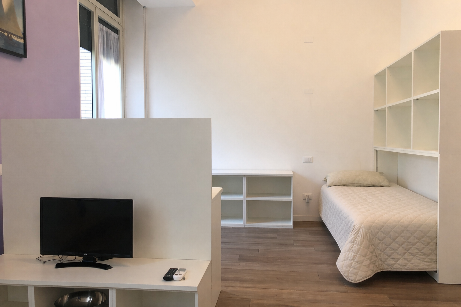 Il monolocale è completo di angolo cottura con piano induzione, piccolo frigorifero e forno microonde, angolo salotto con tavolo, sedie e TV, armadio, libreria, letto singolo e bagno ad uso esclusivo.